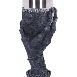 Die Hand des Baphomets fungiert bei diesem Gothic Kelch als Stiel. Die Sabbatziege ist das Symbol für das Gleichgewicht der Gegensätze. Die dunkle, verdorbene Hand greift scheinbar aus dem Nichts, ihre Haut erscheint zerknittert und verwest, die Klauen des Tieres klammern sich an den Kelch. Die Finger sind bis zu den schwarz glänzenden Nägeln in kompliziertem Silberdekor dekoriert. Unser Baphomet Trinkkelch mit Greifhand selbst ist mit einer Fülle von Schnitzereien verziert, darunter eine geschälte Spinne, Motten, Efeu sowie ornamentale Details, die den Rand umkreisen.