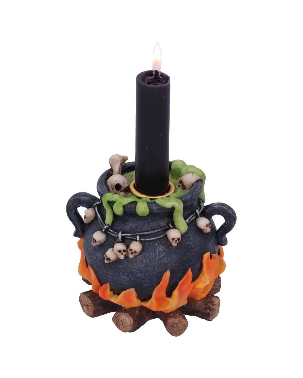 Wenn dunkle Wolken den Vollmond verdecken, geschehen ganz schaurige Dinge am Hexenberg. Im Geäst der alten Eichen leuchten rote Augen auf, und dunkle Schatten huschen über die Felsen. Plötzlich zerreißt ein markerschütternder Schrei die Nacht. Lauf schnell nach Hause, bevor sich das Böse an deine Fersen heftet! Am besten führst du nach diesem Erlebnis eine Ausräucherung durch! Unser blubbernder Hexenkessel Räucherkegel & Kerzenhalter eignet sich hierfür optimal. Der Hexenkessel Rauchkegel Halter ist mit Flammen und Totenköpfen geschmückt. Giftgrünes Gebräu erhebt sich aus dem magischen Kessel – eine eindrucksvolle Wicca Deko für Halloween & Hexen Fans!