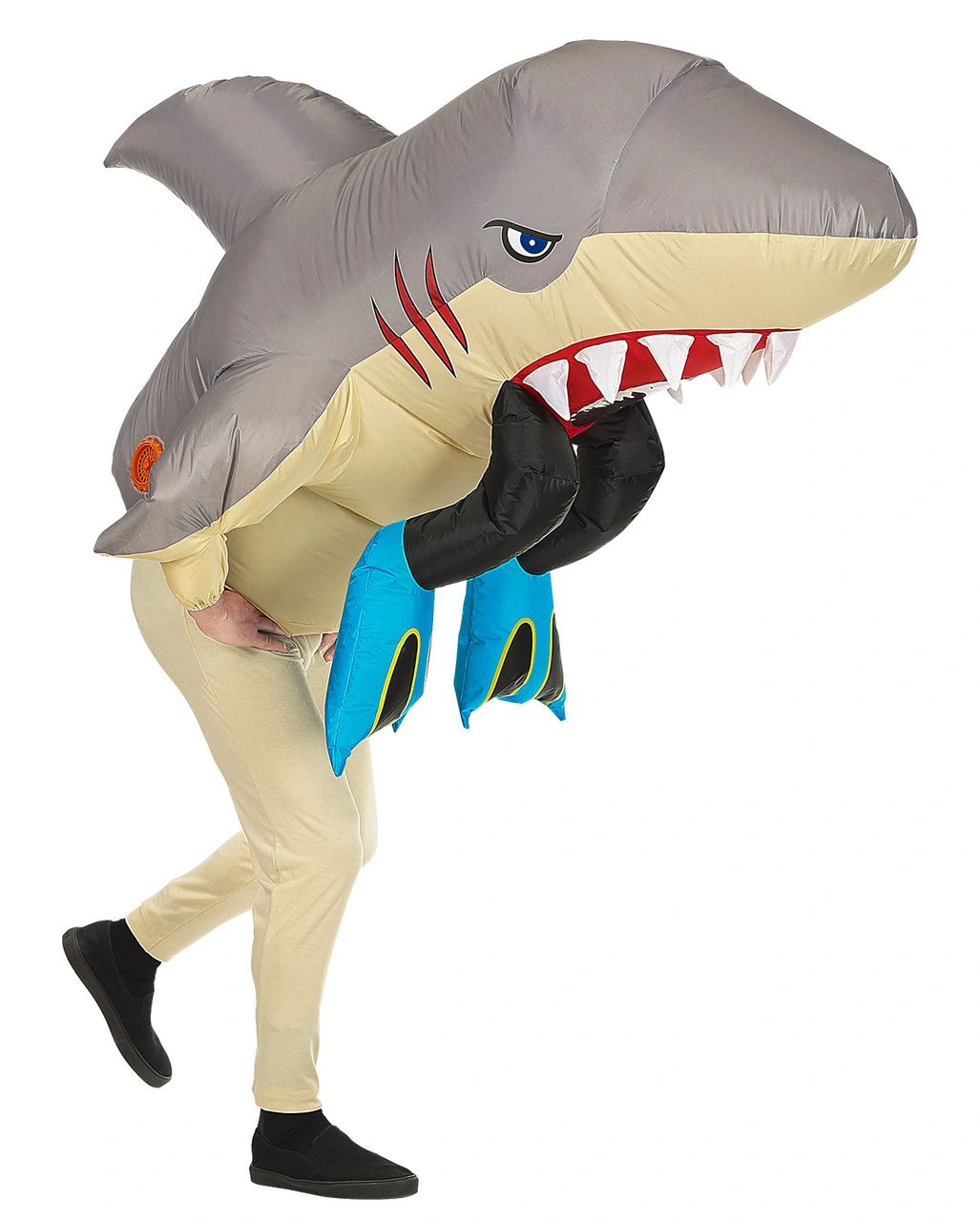 Wenn die unheilschwangere Melodie aus “Der Weiße Hai” ertönt, ist die Gefahr nicht weit. Kostümiere auch du dich in die witzige Version des tödlichen Raubfisches und trage zu Halloween unser außergewöhnliches Hai-Attacke Aufblaskostüm. Die aufblasbare Hai Verkleidung zeigt einen hungrigen weißen Hai, der einen Taucher im Maul hat. Werde mit diesem Aufblas Kostüm zum Brüller auf jeder Faschingsparty.