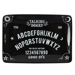 Mit unserer schwarzen Hexenbrett Keramik Schmuckschale hast du ein Deko Accessoire, das für einen magisches Flair sorgt. Hexen und Geisterbeschwörer nutzen das klassische Ouija Brett seit jeher um mit den Toten Kontakt aufzunehmen. Als Deko für Gothic und Horror Fans sind die Zeichen des typischen Hexenbrett aber auch ein perfektes Motiv für die alternative Wohnungseinrichtung. Verschenke unsere düstere Ablage für Schmuck oder Krimskrams an einen Gothic oder Hexen Fan und mache ihn sehr glücklich damit. Oder gönne dir selbst die geniale Keramikschale im Hexenbrett Design und sorge für eine magische Atmosphäre.