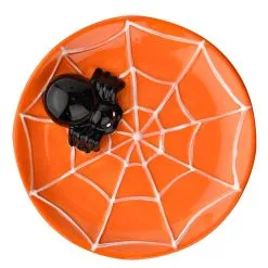 Orangefarbene Teller mit Spinne als Tischdeko für Halloween