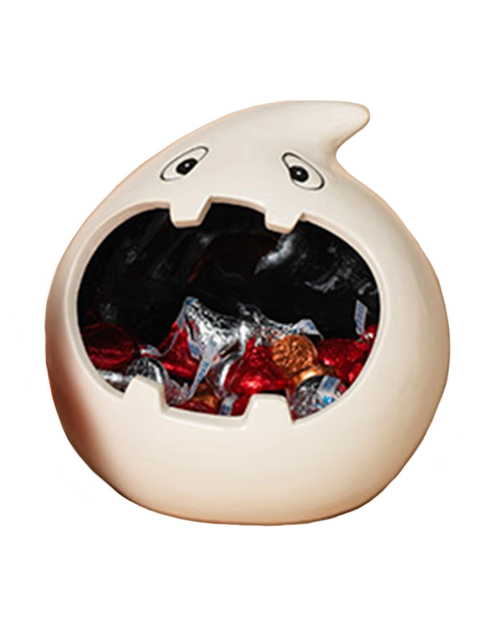 Unsere Süßigkeiten Schale Gruselgespenst ist eine witzige Deko für dein Halloween Buffet. Der Geist kann sein Maul ganz schön weit aufreißen. Er sieht aus, als wolle er die ganzen Süßigkeiten in einem Bissen vertilgen. Aber keine Angst. Hunde, die bellen, beißen nicht, und Keramik Geister, die ihr Maul aufreißen, fressen auch keine Bonbons. Du kannst die kinderfreundliche Halloween Deko also unbesorgt aufstellen.