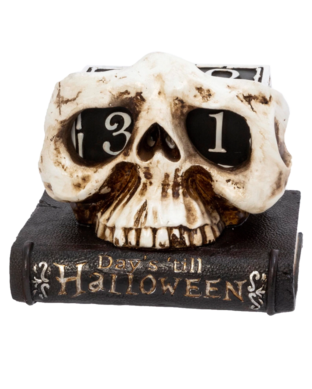 Die Zeit vor All Hallow´s Eve ist voller Magie und Vorfreude. Das Haus wird gruselig dekoriert, die Horror-Kostüme werden ausgesucht, und der ein oder andere übt sich in ausgefallenen Halloween-Rezepten fürs Fest. Mit dem Totenkopf Halloween Countdown Zähler zählst du die Zage zum schönsten Tag des Jahres. Der Halloween Kalender im Totenschädel Design ist zudem ein echter Blickfang an jedem Tisch: Hier zeigt sich ein vermoderter Schädel auf einem antiken Buch. Die Tage bis zum 31. Oktober kannst du in den Augenhöhlen ablesen – einfach fantastisch!