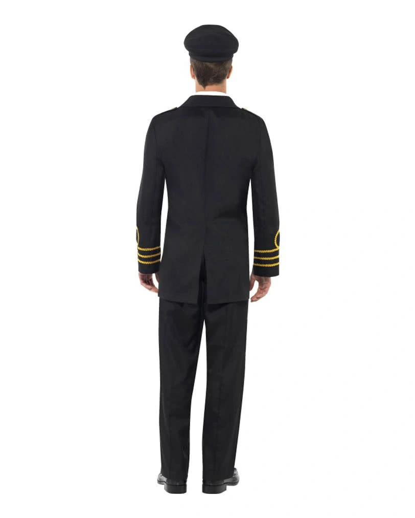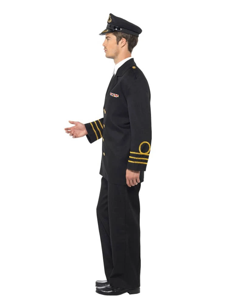 Das US-Marineoffizier Herren Kostüm ist sehr detailgetreu gestaltet. Das zeigt sich unter anderem an den Marineabzeichen auf der Mütze oder auf der Uniformjacke. Die Jacke selbst ist in Schwarz gehalten und an den Ärmelenden sind goldfarbene Verzierungen aufgenäht. In der gleichen Farbe sind auch die Knöpfe auf der Frontpartie des Jackets. Darunter werden ein weißer Hemdeinsatz und eine kleine schwarze Krawatte getragen. Die komfortable schwarze Anzughose überzeugt mit ihrer Schlichtheit. Zu besonderen Anlässe wie etwa Kostümpartys aller Art trägt ein Offizier seine Insignie Leutnant Schwert im Schwerthalter.