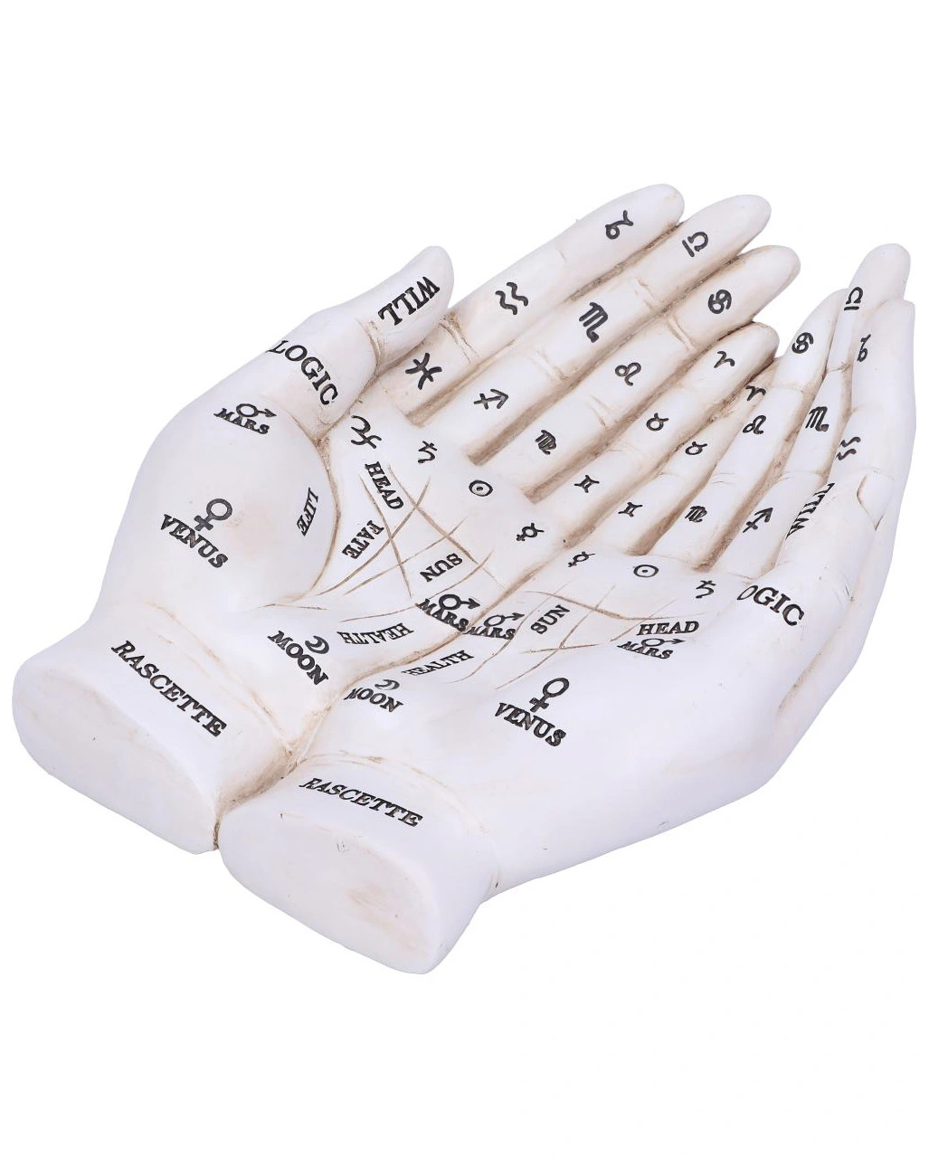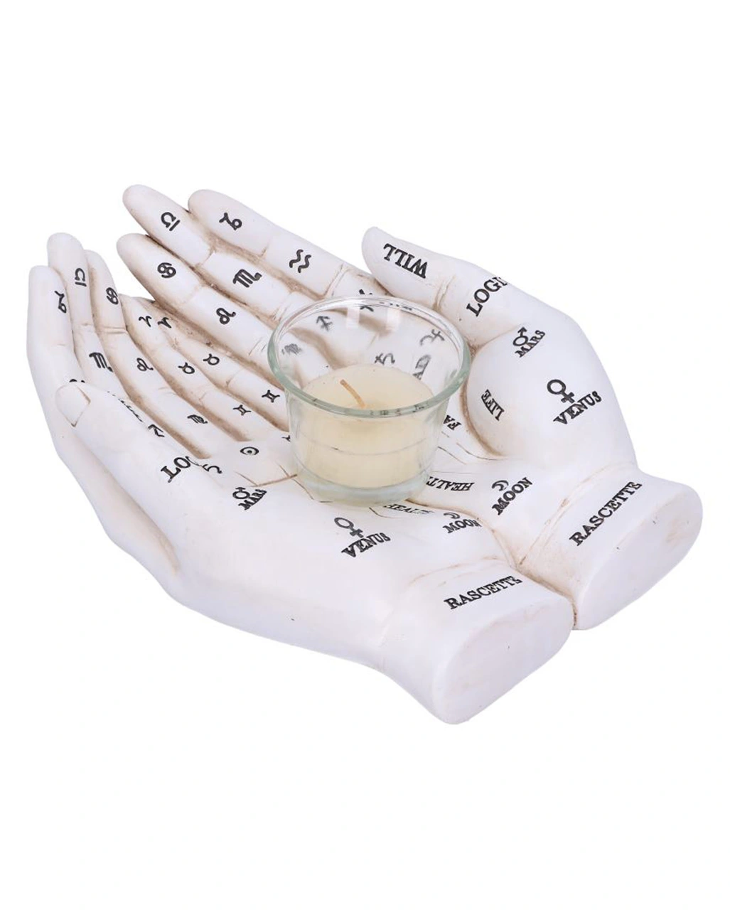 Die Chiromantie bezeichnet die alte Handlesekunst. Laut dieser kann man die Zukunft eines Menschen in seiner Handfläche ablesen. Unser Weiße Chiromantie-Hände Teelichthalter ist eine wunderschöne Esoterik Deko, die zwei geöffnete Hände aus Polyresin zeigt. In diesen befinden sich kleine schwarze Symbole und ein gläserner Teelichthalter.